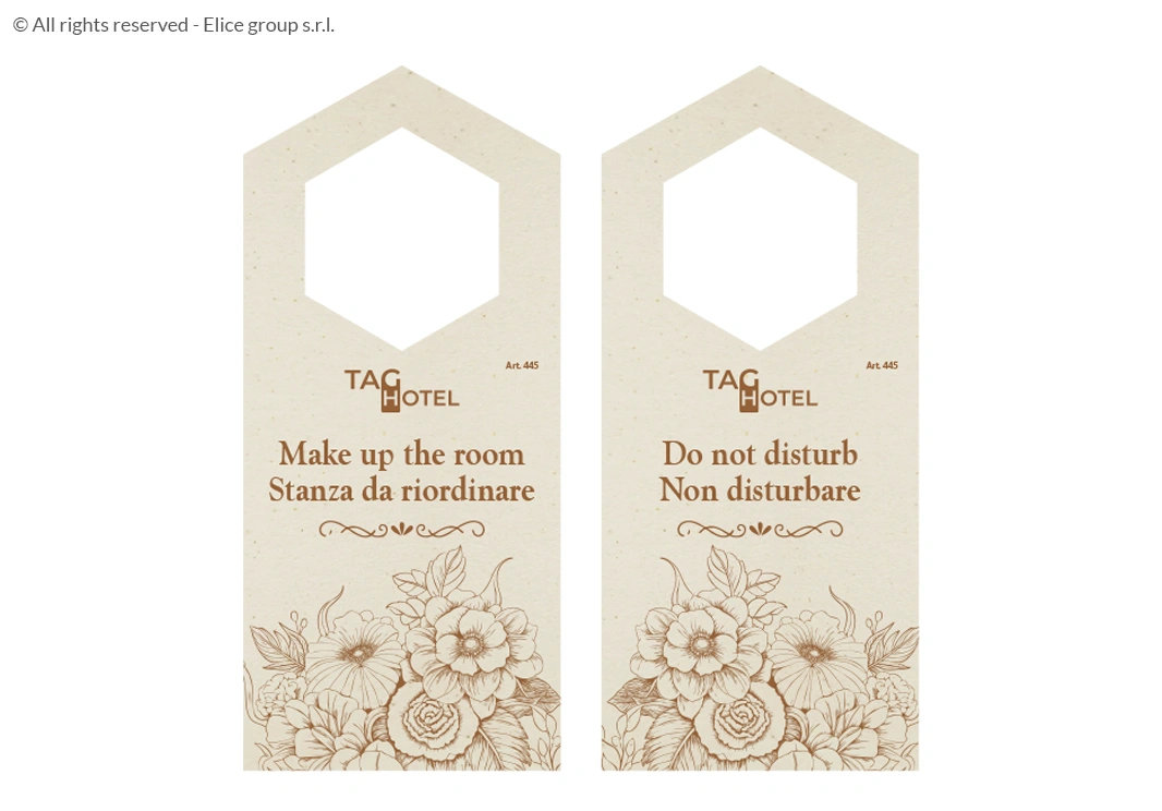 Prodotti interamente in Italia, questi segnaporta uniscono l’originalità della forma alla qualità superiore dei materiali Taghotel. Puoi scegliere la plastica riciclabile per una durata massima e una facile pulizia, oppure puntare sull’eleganza naturale della carta Shiro Echo o della carta ecologica.