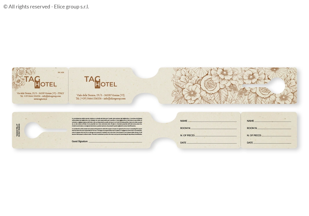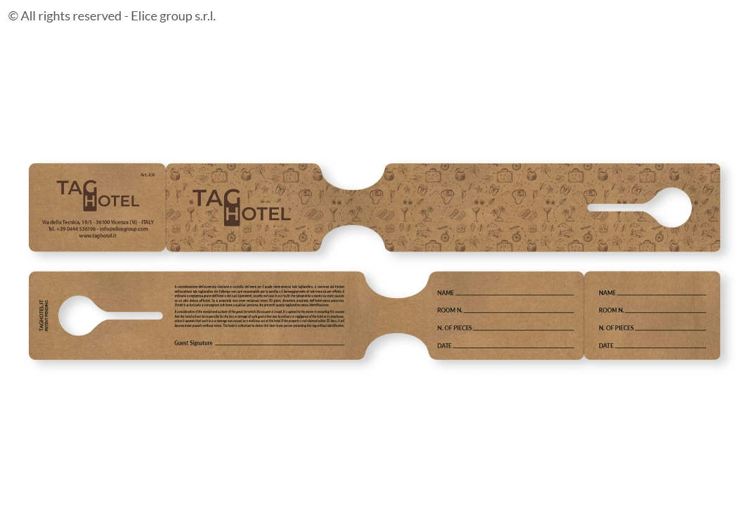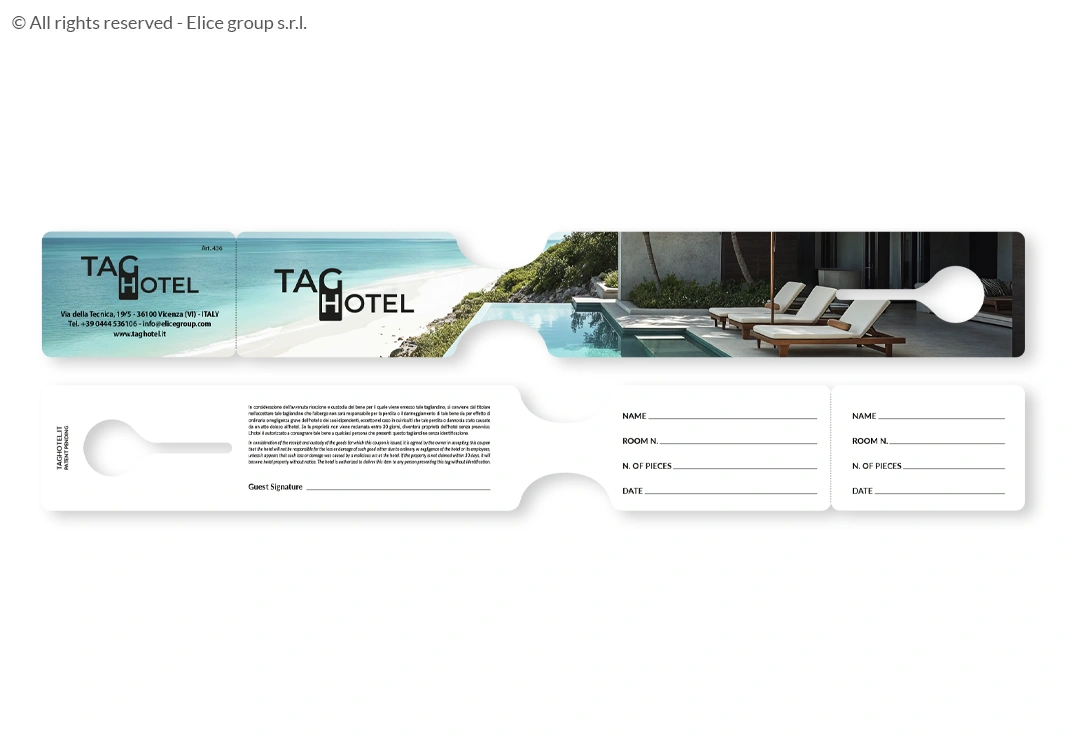 - L’etichetta è inoltre caratterizzata da un’appendice, questa si stacca con uno strap e funge da biglietto da visita dell’hotel. Qui si si possono infatti stampare a colori: logo dell’hotel, numero di telefono, indirizzo. All’ospite dell’hotel si consegna questa targhetta come una ricevuta. Da un lato ha i recapiti dell’hotel e dall’altro i dati identificativi e fondamentali. La valigia è quindi consegnata al cliente immediatamente. Gli altri dati come: nome del viaggiatore, numero di camera, numero delle valigie e data di check-in o check-out, sono scritti negli spazi dedicati e prestampati. Grazie al trattamento in superficie, si può scrivere con una semplice penna a sfera.