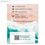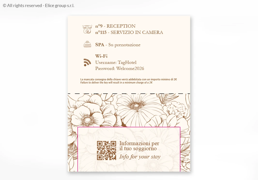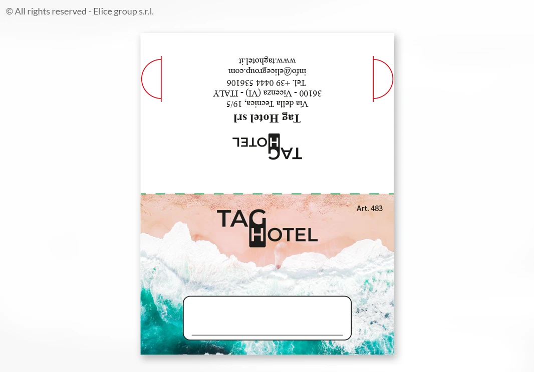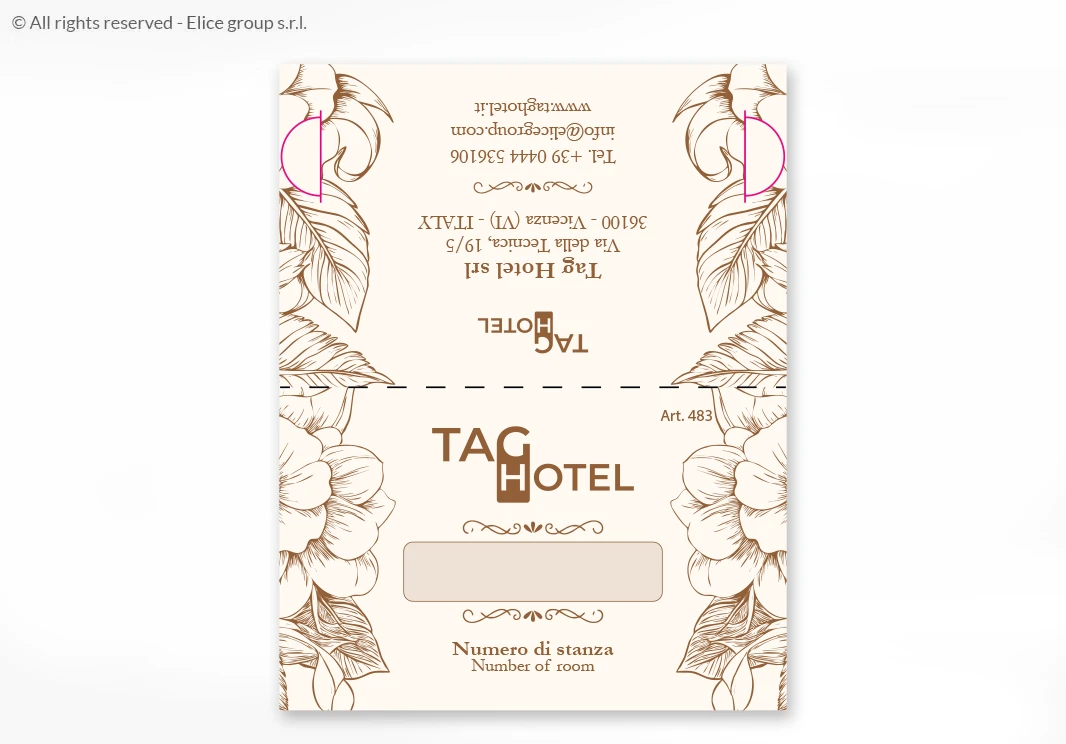 La chiusura a libro è pensata per garantire la totale privacy dell’ospite, proteggendo la chiave e le informazioni riservate durante il soggiorno. Realizzato interamente in Italia, il porta-chiavi dispone di spazi dedicati per il numero di camera e messaggi di benvenuto, ed è personalizzabile su entrambi i lati.