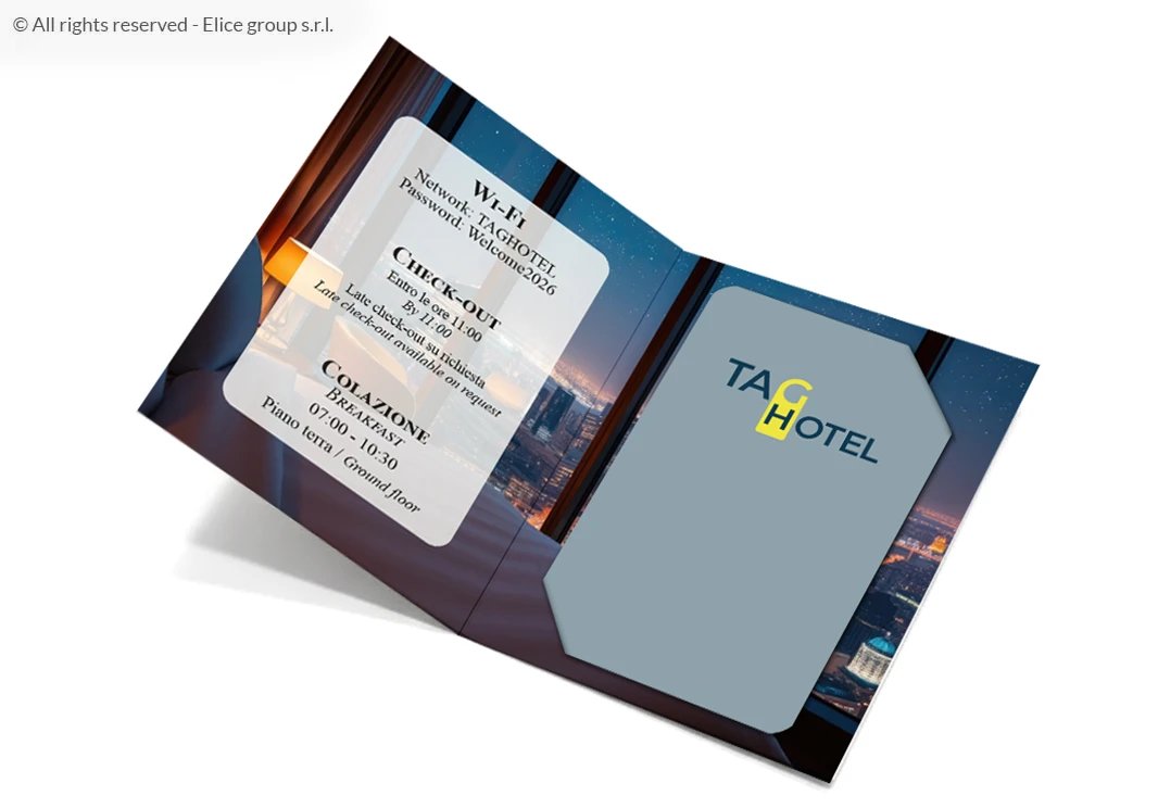 Disponibili nelle nostre carte d’eccellenza: Shiro Echo per un feeling naturale, carta ecologica o patinata opaca per colori brillanti e dettagli nitidi. Un accessorio Made in Italy che trasforma il momento del check-in in un’esperienza di benvenuto curata e professionale.