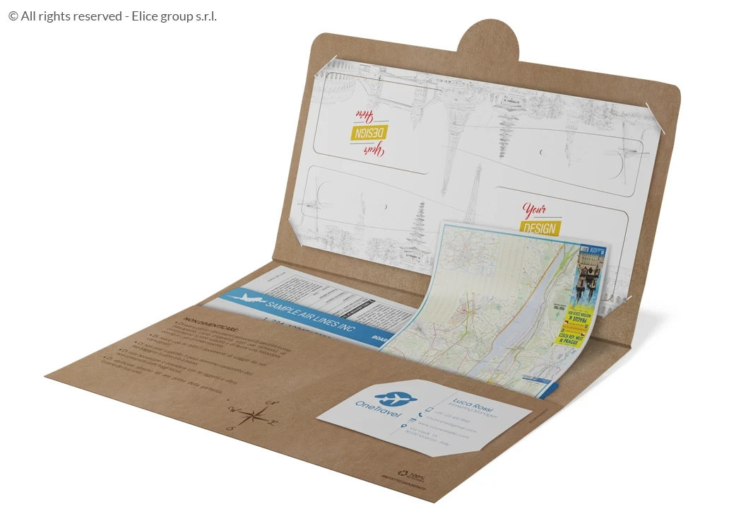 • Il porta documenti smart da viaggio è un prodotto esclusivo e brevettato. Volendo lo si può anche personalizzare su tutta la superficie esterna e sulla tasca interna con una grafica studiata dai nostro grafici, scegliendo il servizio dedicato di elaborazione grafica